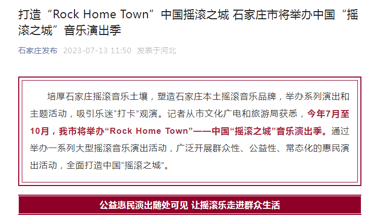 “石家庄,作为名副其实的Rock Home Town——摇滚的家乡又要放大招了!”7月13日,河北本地媒体报道了省会石家庄市将于今年7月至10月举办“Rock Home Town”——中国“摇滚之城”音乐演出季一事。