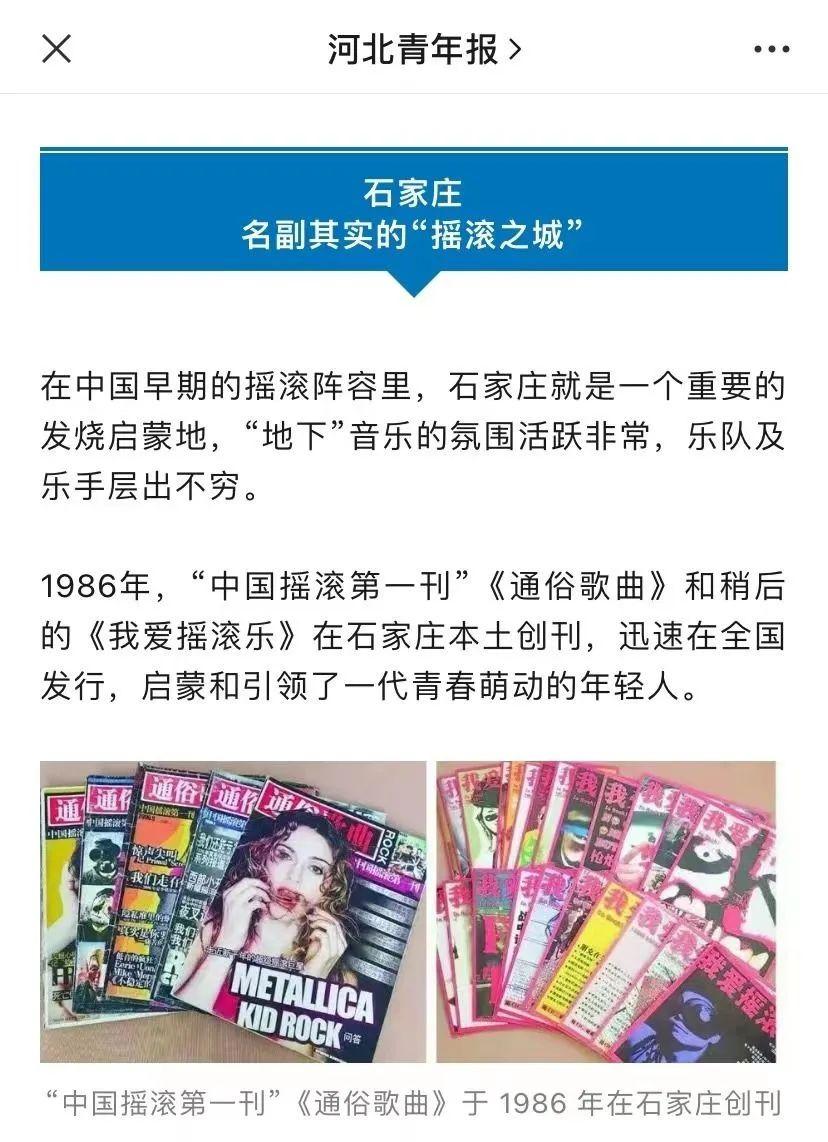 1986年,“中国摇滚第一刊”《通俗歌曲》和稍后的《我爱摇滚乐》在石家庄本土创刊,迅速在全国发行,启蒙和引领了一代青春萌动的年轻人。