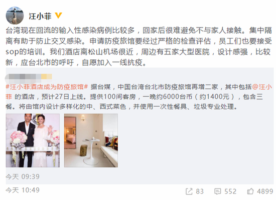 据台媒报道,近日,汪小菲酒店将成为防疫旅馆,住宿价格也随之曝光,防疫1天包3餐6000台币(约人民币1400元),14天的隔离要价8万4000台币(约人民币19686元),外传此举是为了救饭店业绩,对此,汪小菲于3月26日在个人社交平台上发声:“应台北市的呼吁,自愿加入一线抗疫。”