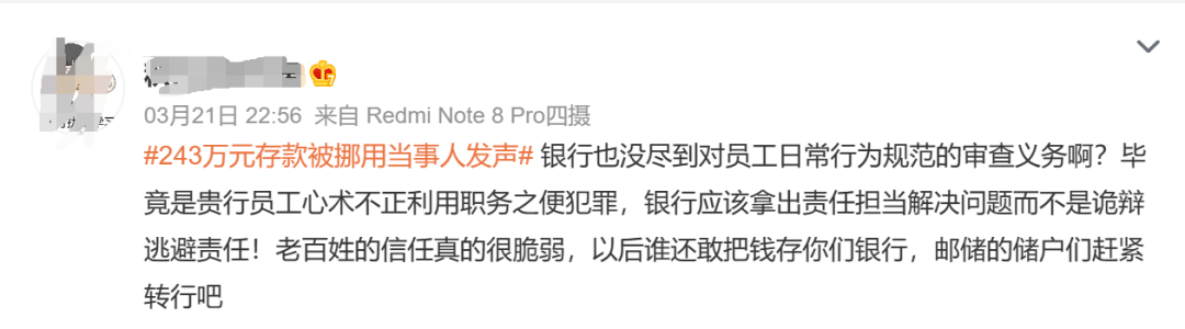 有网友指出,银行也没尽到对员工日常行为规范的审查义务啊?毕竟是贵行员工心术不正利用职务之便犯罪,银行应该拿出责任担当解决问题而不是诡辩逃避责任!