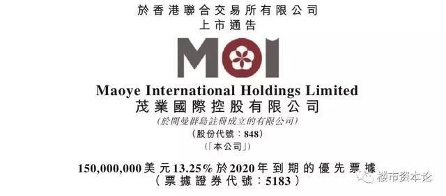 据公告,茂业国际在2018年10月发行了一笔总额1亿美元,年利率为13.25%的债券。单从利率看,已高居彼时同行企业发债利率榜的榜首。