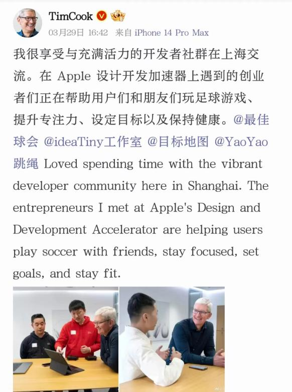 库克与望尘科技员工交流《最佳球会》。图源:库克微博