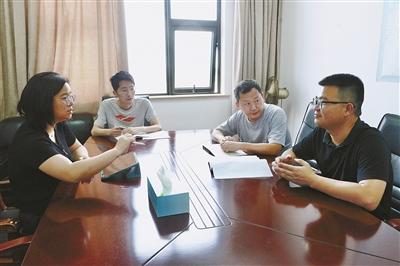 “甬江红小二”向企业人员(右一)讲解相关政策,开展助企服务。(罗秋玲黄程摄)