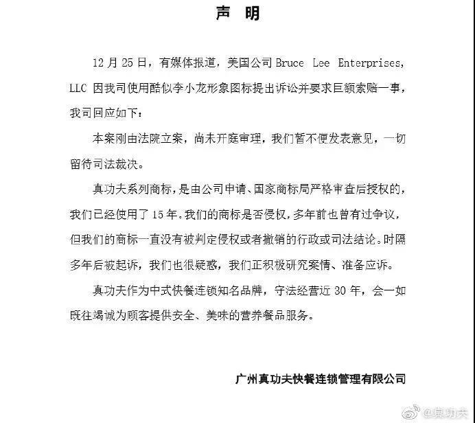 中新网26日晚消息称,真功夫回复称,只是收到法院关于美国加州的Bruce Lee Enterprises, LLC公司诉讼的相关材料,