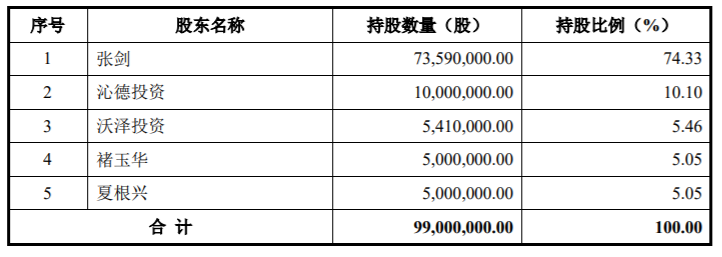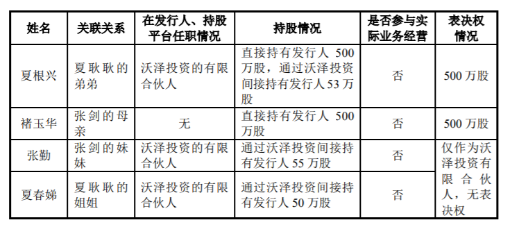 招股书显示,目前泽宇智能的控股股东为张剑,实际控制人为张剑、夏耿耿夫妇。其中,张剑担任发行人董事长,直接持有泽宇智能74.33%的股份,通过沁德投资间接持有0.95%的股份;褚玉华直接持有5.05%的股份;夏根兴直接持有5.05%的股份,通过沃泽投资间接持有0.54%的股份;张勤通过沃泽投资间接持有0.56%的股份;夏春娣通过沃泽投资间接持有0.51%的股份,家族持股比例共计86.99%。