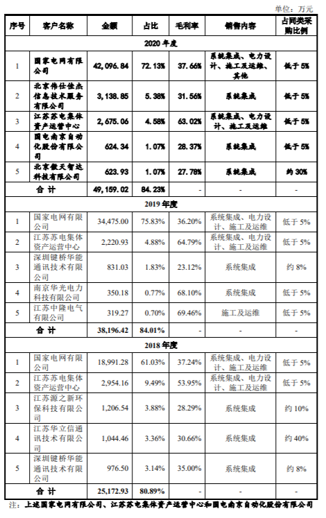 招股书显示,合并后报告期各期(2018年度-2020年度),泽宇智能前五大客户销售收入占比分别为80.89%、84.01%和84.23%,客户集中度较高,其中第一大客户为国家电网有限公司及相关下属单位,其营业收入占公司当期营业收入的比例分别为 61.03%、75.83%和 72.13%,销售占比相对较高。