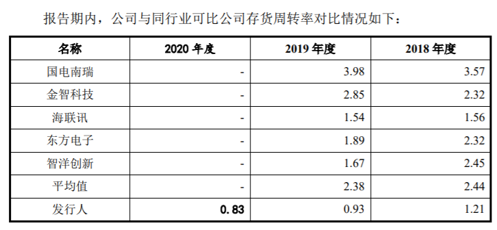 界面新闻记者注意到,报告期内,泽宇智能存货周转率分别为1.21、0.93和0.83,呈逐年递减趋势,相比同行业可比公司偏低。
