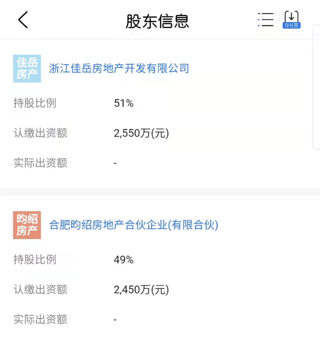 爱企查信息显示,宁波鸣翠东著项目的开发企业宁波兆年为浙江佳霖的全资子公司,并由浙江佳岳房地产开发有限公司(简称:浙江佳岳)、慈溪花创分别持股51%、49%。