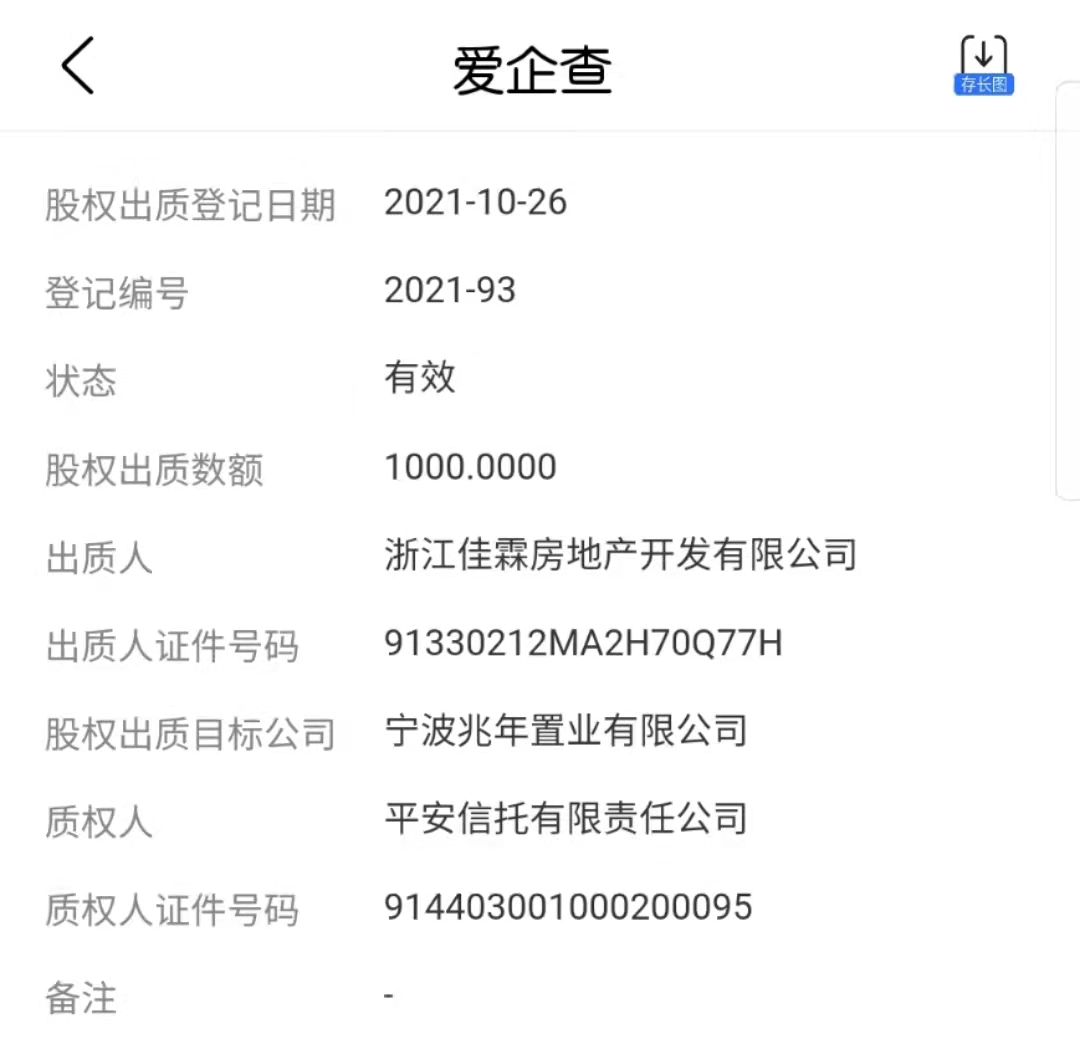 从时间来看,宁波兆年股权出质的时间是2021年10月26日,出质人为浙江佳霖房地产开发有限公司(简称:浙江佳霖),质权人为平安信托有限责任公司。
