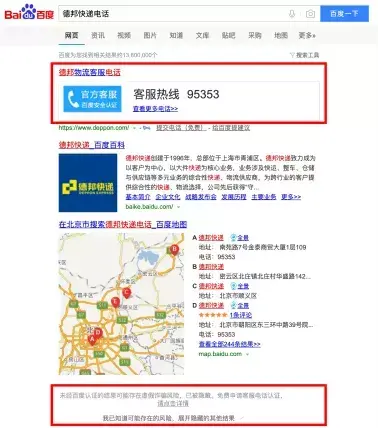 2018年4月,有网友在发大件快递时通过百度搜索德邦,发现搜索结果首条显示的并非官方正规的德邦物流,而是