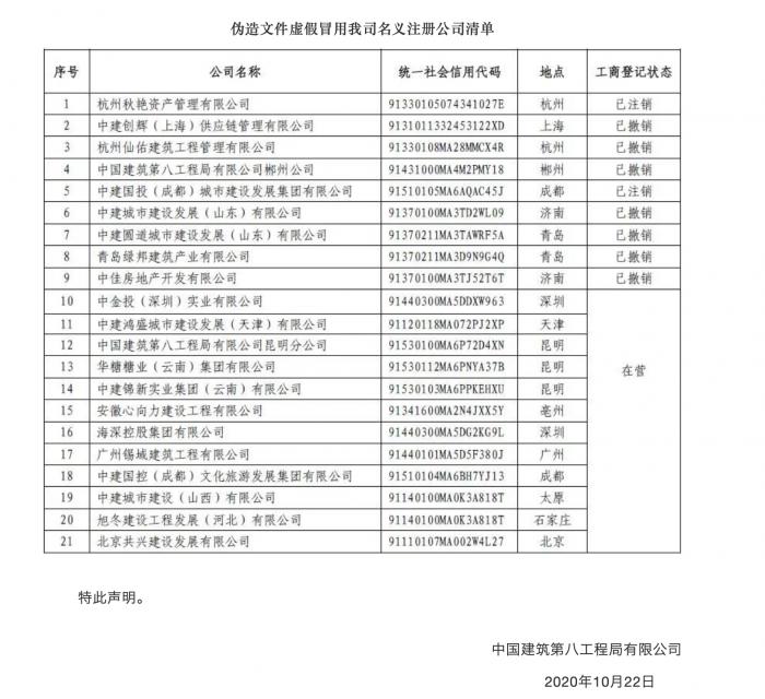 中建八局称,从未注册、收购、增资入股“伪造文件虚假冒用我司名义注册公司清单”里的公司,也从未授权任何组织、个人以我司名义注册、收购、增资入股下述公司;我司与下述公司不存在任何形式的出资、隶属、关联或实际控制关系;下述公司注册/变更股东所提交的与我司相关的文件或资料是虚假的或伪造的。下述公司及其相关人员以我司或其自身名义对外所从事的所有业务与我司无关,我司对下述公司及其相关人员的任何活动和行为自始不承担任何形式的经济或法律责任。