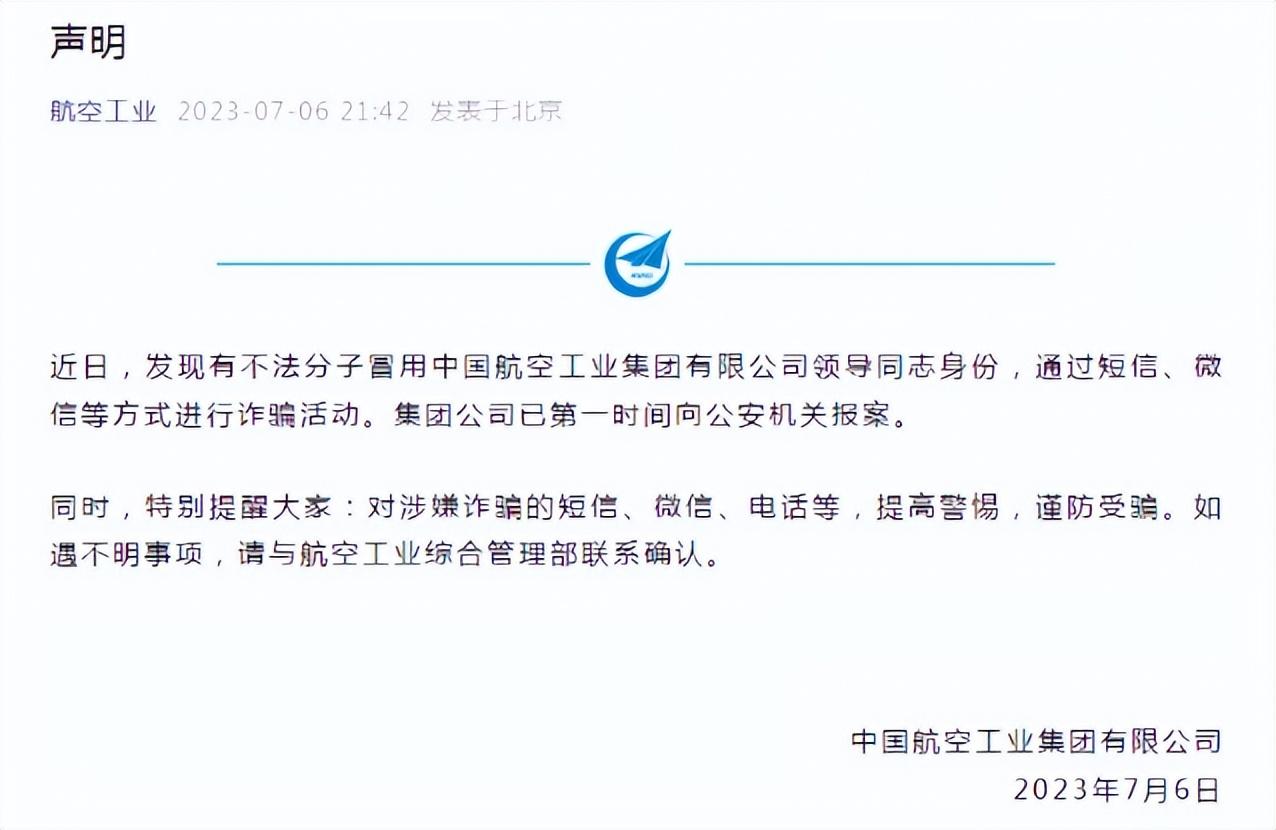 有不法分子冒用中国航空工业集团有限公司领导同志身份