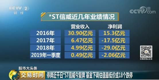 千呼万唤始出来!在停牌超过两年半之后,*ST信威今日终于复牌,而在公司股票停牌期间却遭遇连续爆雷。一方面,*ST信威业绩大幅下滑。2016年至2018年,公司营业收入分别为30.9亿元、6.47亿元和4.99亿元,净利润分别为15.3亿元、负17.5亿元和负29亿元。2019年一季度,公司净利润继续亏损2.06亿元。