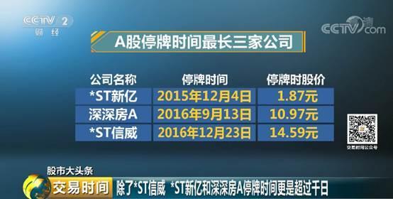*ST信威已遭遇多家基金对其估值进行下调,值得注意的是,新华基金、汇添富等基金公司只愿给予它5.76元/股的估值;工银瑞信、华泰柏瑞给的估值只有5.65元/股,此估值需要*ST信威连续18跌停才能达到。而*ST信威近千日的停牌时间并不是最长的, 它在A股中仅是排名第三的。目前*ST新亿和深深房A的停牌天数是超过它的。这三只股票停牌前的价格分别定格在1.87元,10.97元,14.59元。