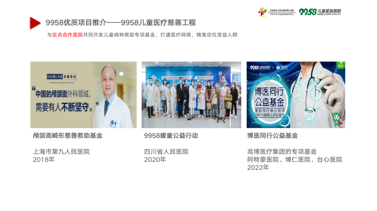 9958儿童紧急救助项目于2012年7月1日正式运营、历时近11年;设立全国第一条儿童紧急救助热线“400-006-9958”民间儿童医疗救助的“120”;