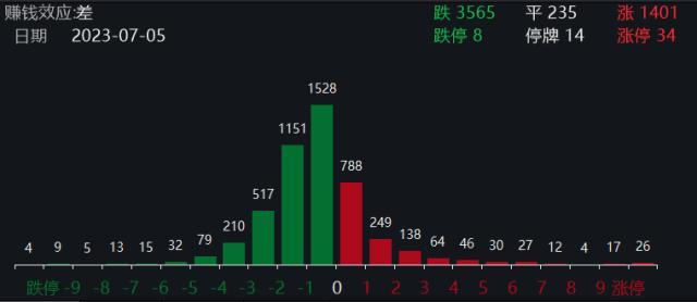 个股方面,两市总体跌多涨少,今日共计1401只个股上涨,3565只个股下跌,235只个股持平,赚钱效应由“好”转为“差”。