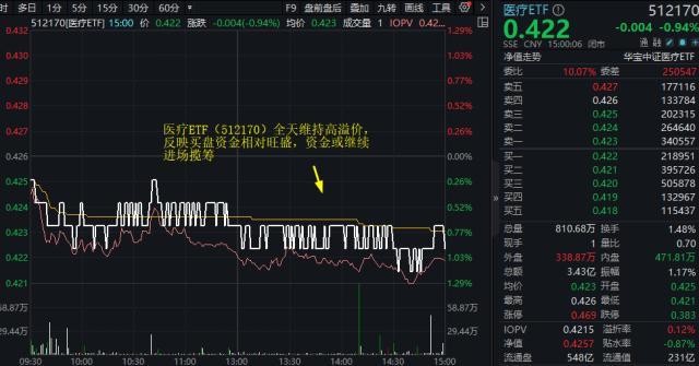 ETF方面,板块头部医疗ETF(512170)缩量下跌,截至收盘场内价格跌0.94%,全天成交3.43亿元。值得关注的是,