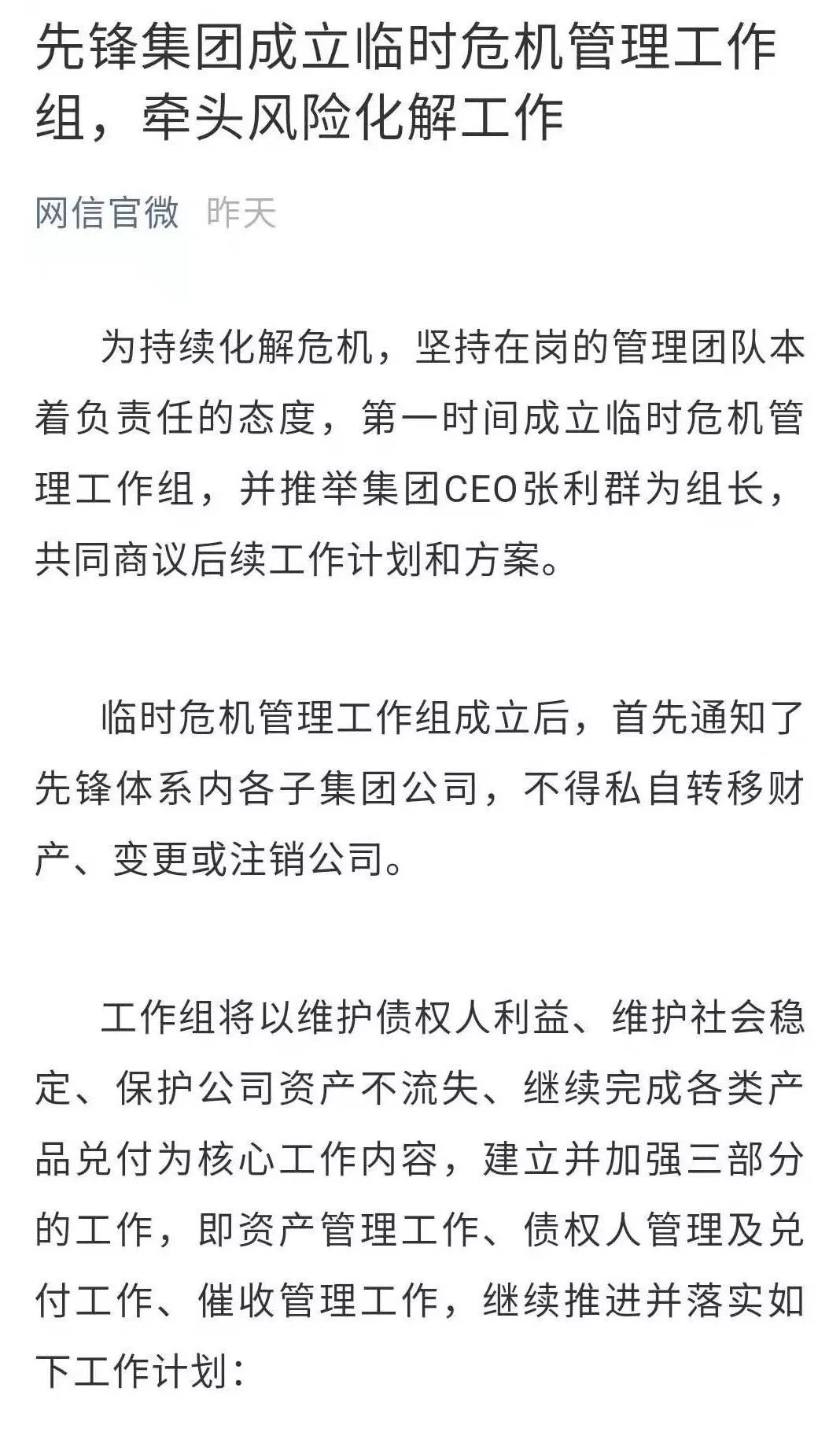 就在发布讣告的同时,网信官微同步发布了一则《先锋集团成立临时危机管理工作组,牵头风险化解工作》的公告,表示已第一时间成立临时危机管理工作组,并推举集团CEO张利群为组长,共同商议后续工作计划和方案。