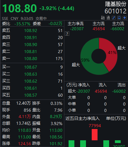周五早盘,隆基股份开盘走低,截至发稿,该股跌近4%,报108.8元。