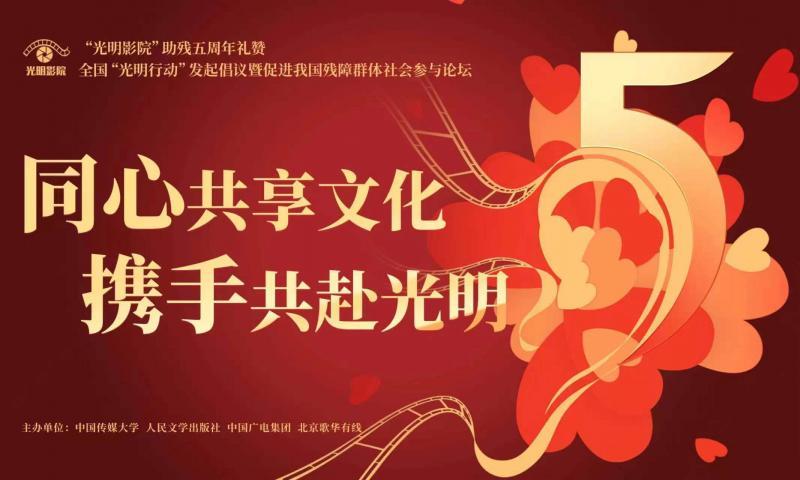 5月19日,在第三十三次全国助残日到来之际,中国传媒大学联合人民文学出版社、中国广电集团、北京歌华有线举办文化助残系列活动,活动围绕“同心共享文化 携手共赴光明”这一主题,发起全国“光明行动”倡议,并组织召开“丰富我国残障群体社会参与”论坛。本次活动为庆祝“光明影院”公益项目开展五周年,以促进残障群体的社会参与为目标,联合社会各界发起“光明行动”计划倡议,助推文化成果共享,向世界讲好中国的人权故事。