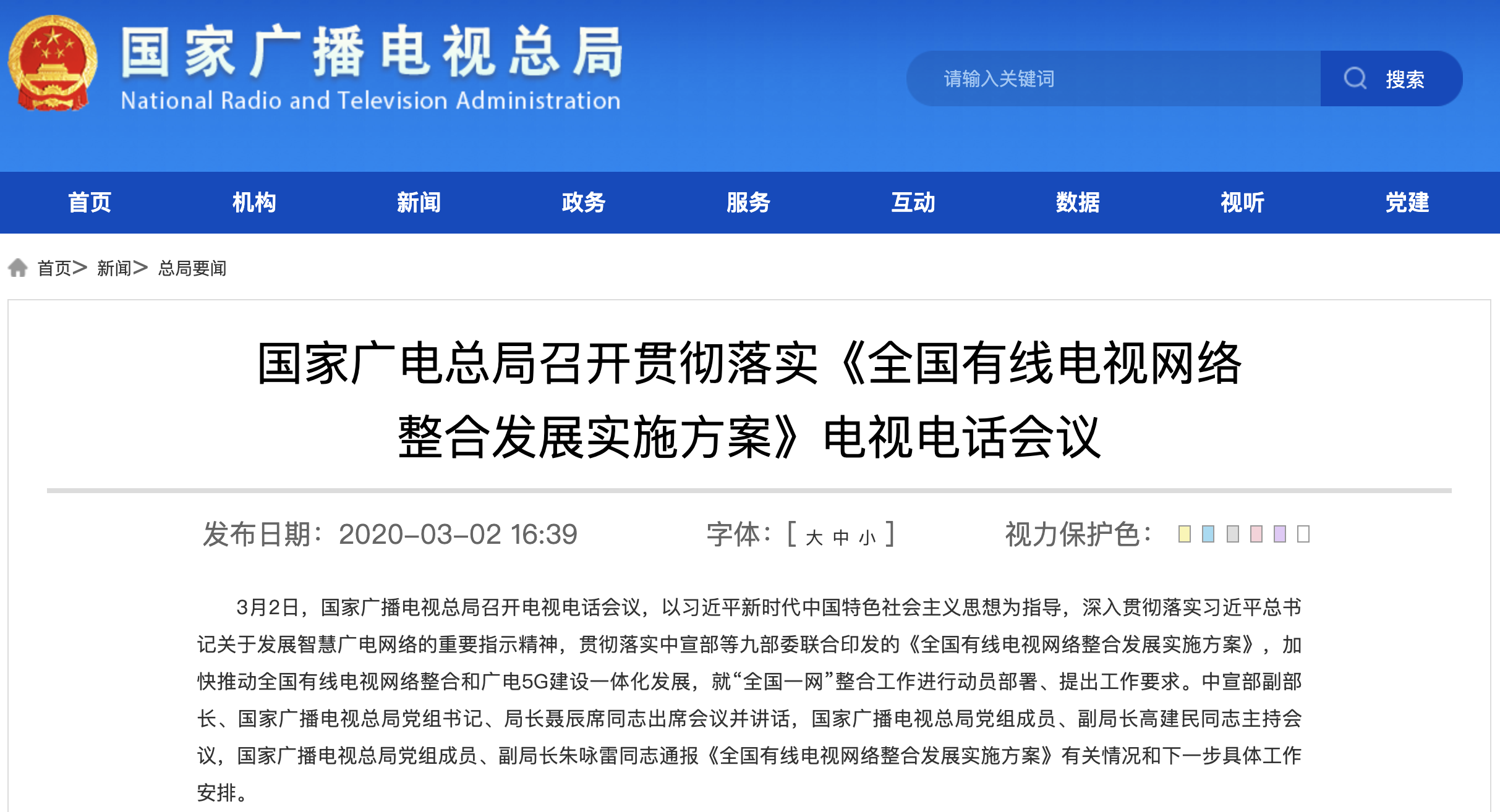 据新华社报道,国家广播电视总局3月2日在京召开电视电话会议,启动全国有线电视网络整合和广电5G建设一体化发展工作。根据方案,“全国一网”整合将由中国广播电视网络有限公司主导,联合各省级网络公司、战略投资者共同组建,形成按现代企业制度管理的“全国一网”股份公司。