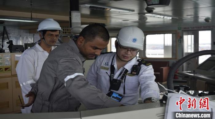 图为施小雷(右一)在船舶安检工作中。 洋浦海事局供图
