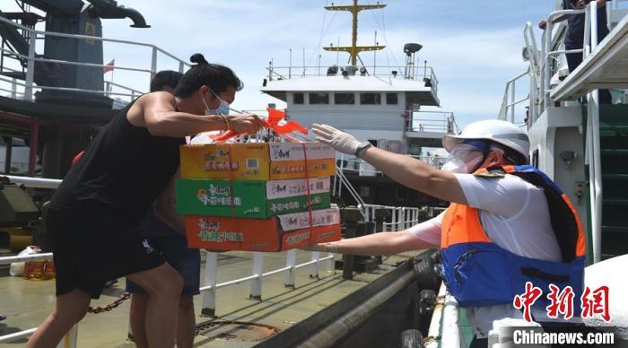 图为施小雷(右一)在疫情期间帮助船方运送物资。 洋浦海事局供图
