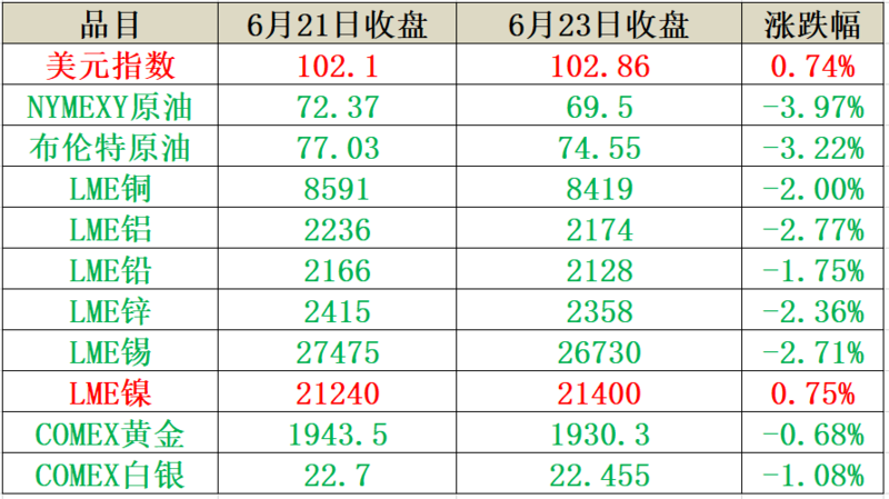指数在6月21日下跌后连涨两日,6月22日单日上涨0.31%,6月23日上涨0.46%。美元本周成功结束此前三周连跌的态势,周线收涨0.56%。其中6月22日期盘中最低一度触及101.88的低位,刷新5月11日以来的新低。此前美联储主席鲍威尔在国会作证时发出了未来将进一步加息的信号,但他也承诺联储将谨慎行事。同时,当被问及降息时,鲍威尔称,“我们不认为这很快就会发生......必须等到我们确信通胀正朝着美联储2%的通胀目标回落。”