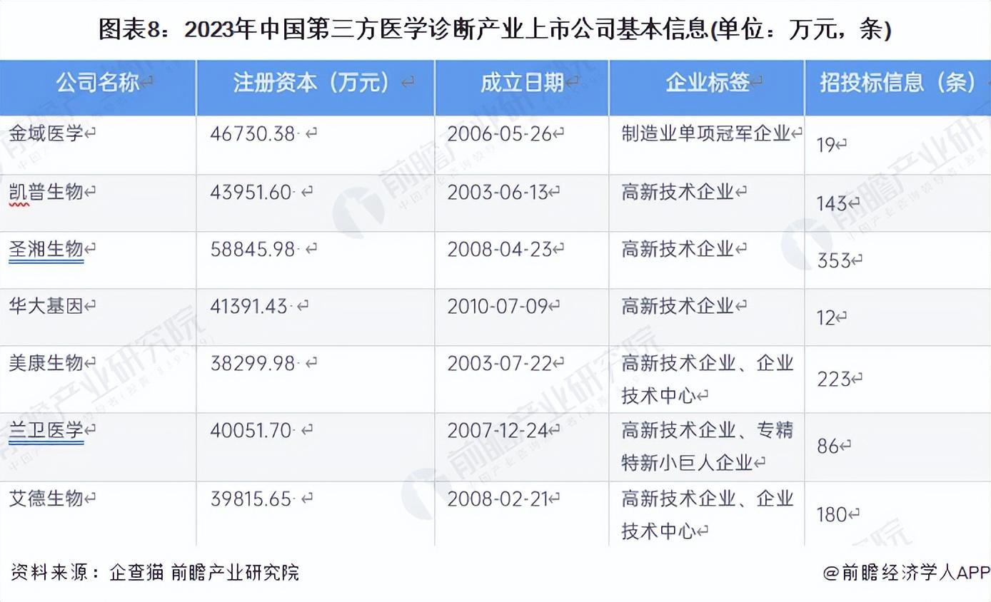 从第三方医学诊断行业的上市企业布局和已有公开信息分析,注册资本最多及成立时间最早的是凯普生物,招投标信息最多的是圣湘生物。