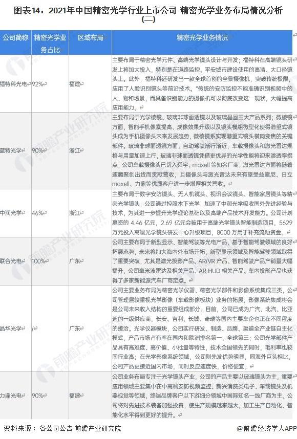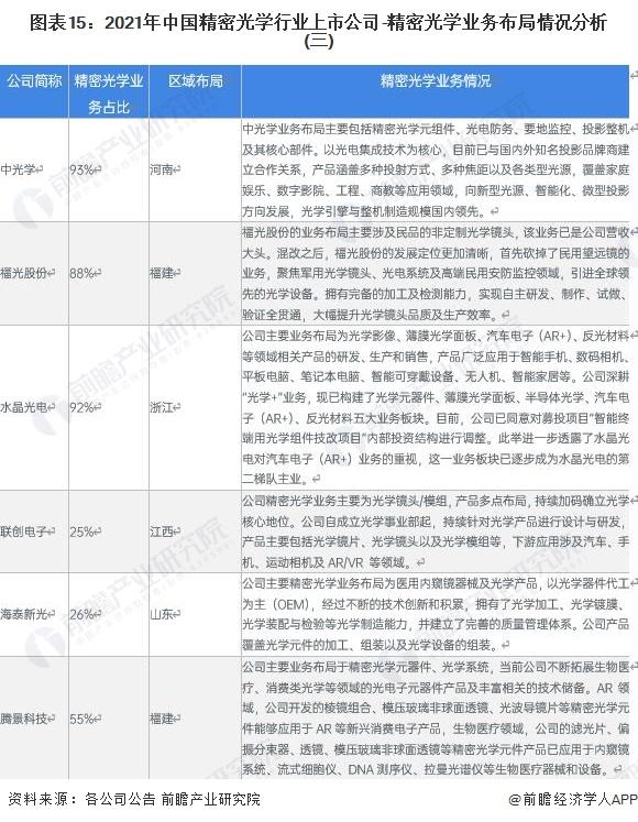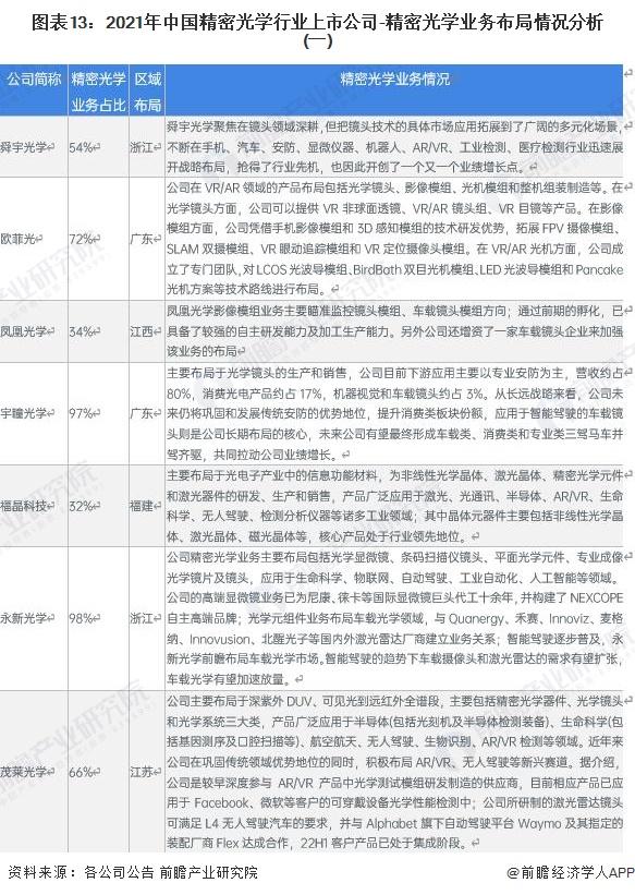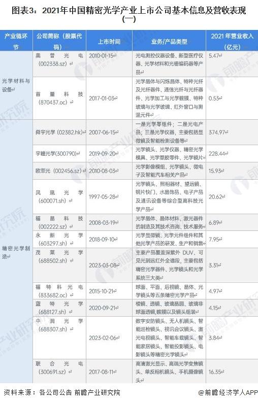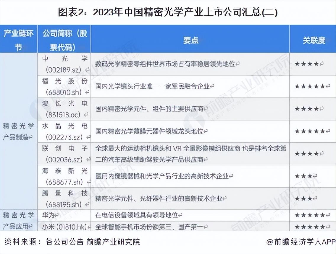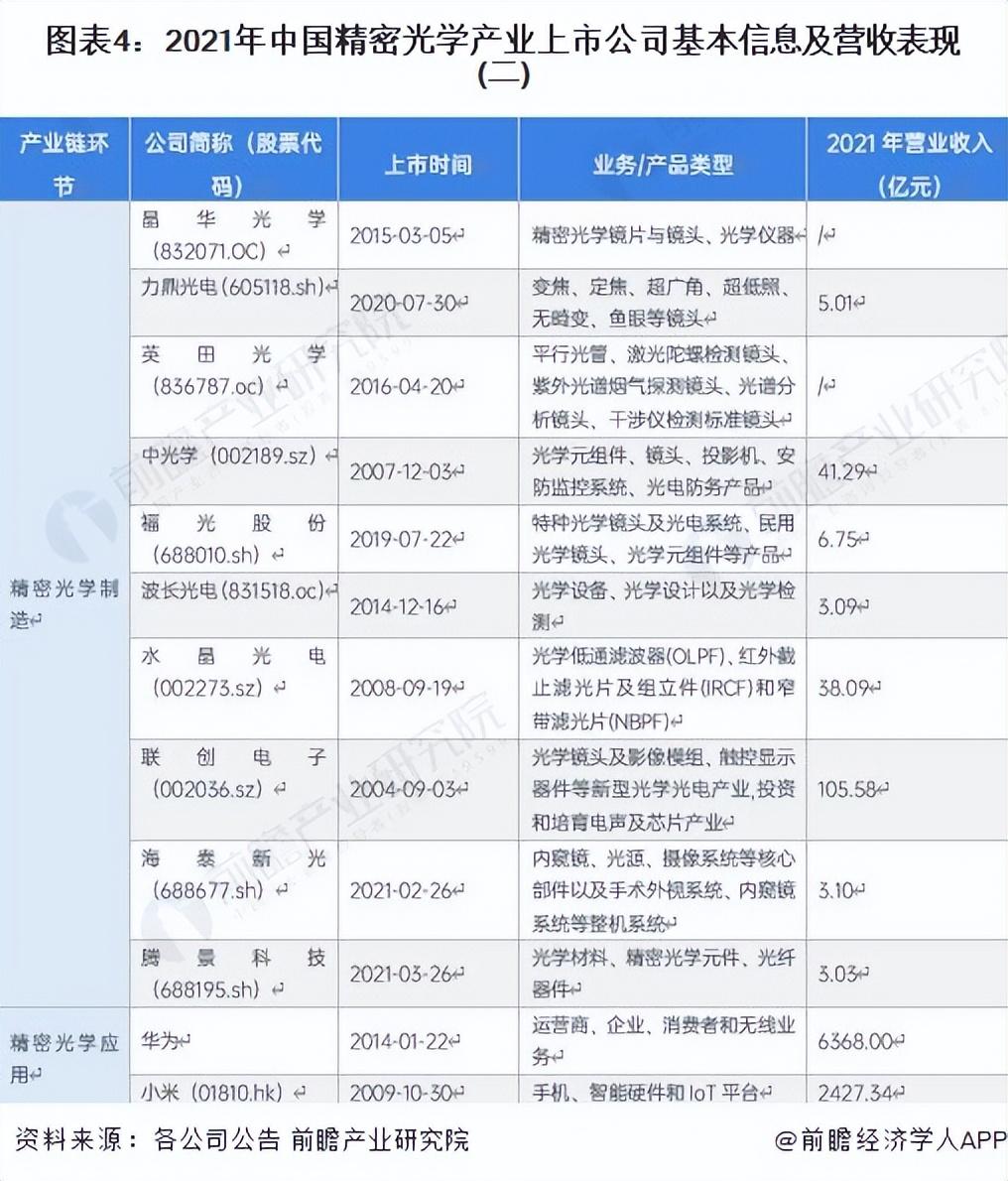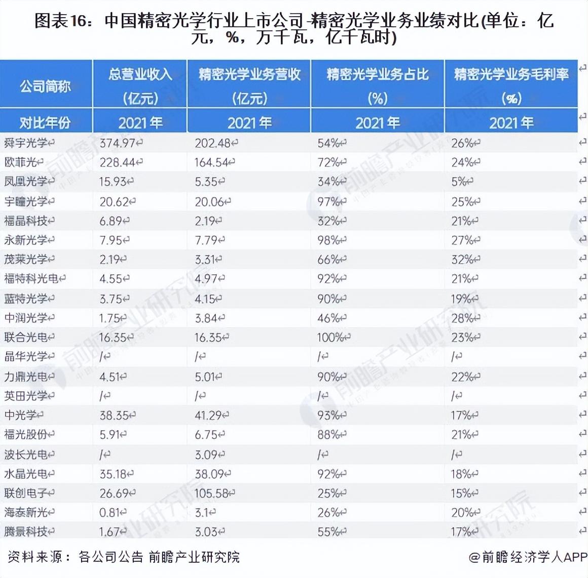 精密光学行业上市公司总营业收入;精密光学行业上市公司精密光学业务占比