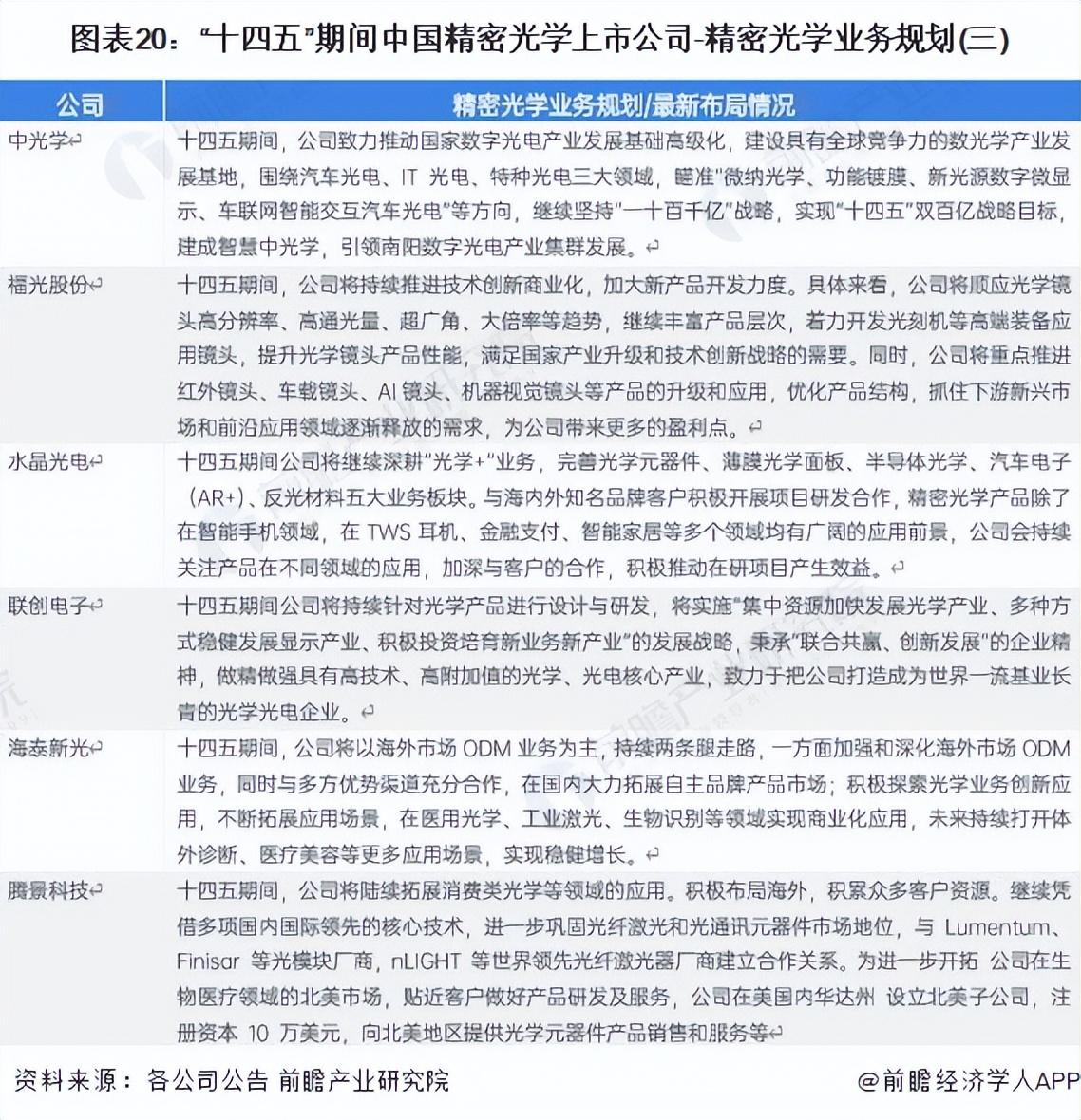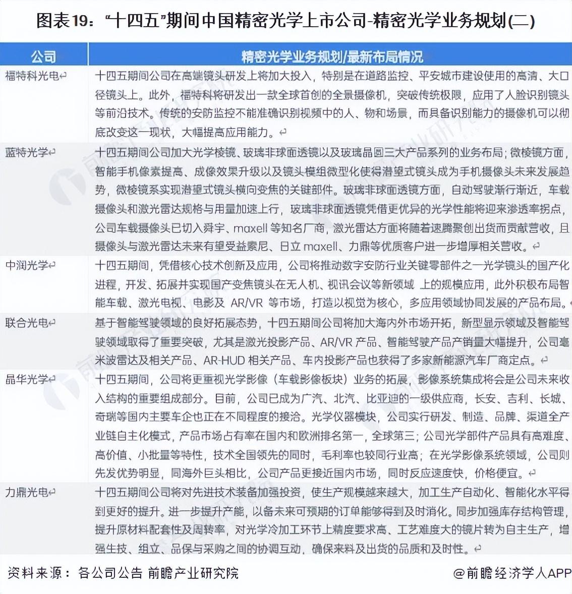根据“十四五规划和2035年愿景目标纲要”,“十四五”期间,我国将大力支持精密光学产业发展。据此,精密光学行业的头部企业-欧菲光、舜宇光学等也相应提出了其“十四五”期间的发展目标,舜宇光学表示“十四五”期间以千亿目标为基数,成为全球领先的智能光学系统方案解决商及系统方案集成商,公司的品牌影响力与竞争力显著增强,人均销售达到150万元以上。此外,精密光学行业其他上市公司也明确了其精密光学业务的发展布局: