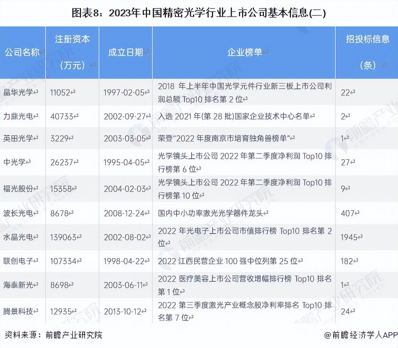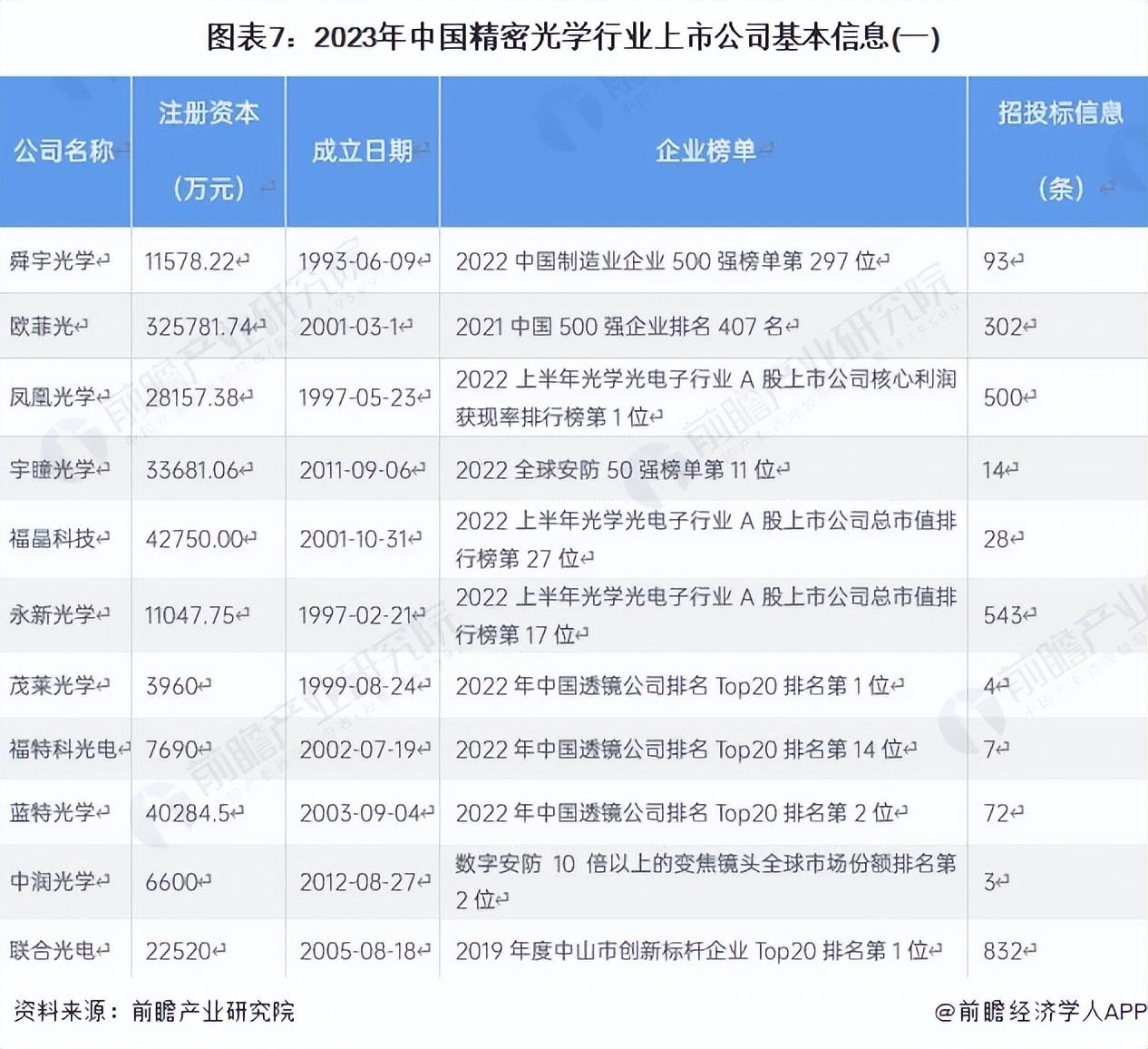从精密光学行业的上市企业布局和已有公开信息分析,注册资本最多的是欧菲光,而成立时间最早的是舜宇光学,招投标信息最多的是永新光学。
