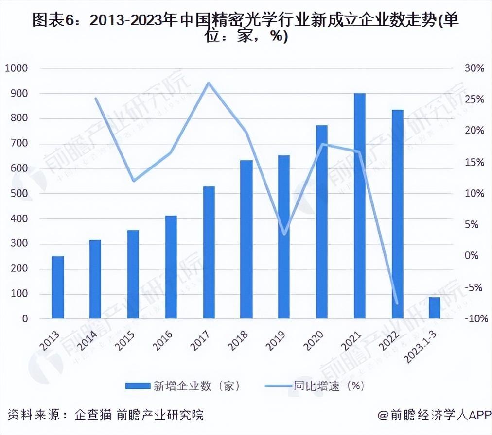 国内精密光学行业中大部分企业仍然依靠低成本在低端器件领域竞争,缺乏核心技术和自主品牌,总体上的竞争力仍较为薄弱,位于产业链的低端。根据企查猫的数据显示,中国精密光学行业新成立企业数在2013-2021年呈现逐步上升趋势。在2021年,新成立企业数达到903家;而2022年,中国精密光学行业新成立企业数为835家,同比下降8%,但整体仍处于较高量级,行业竞争加剧。