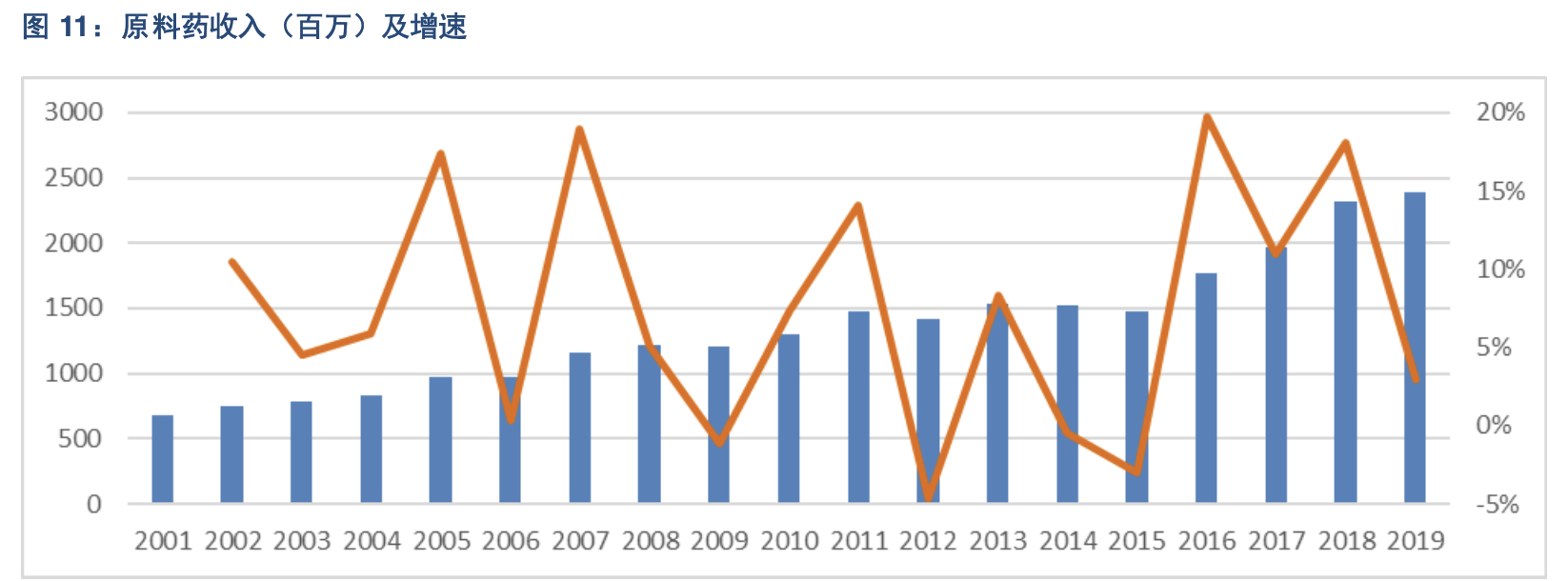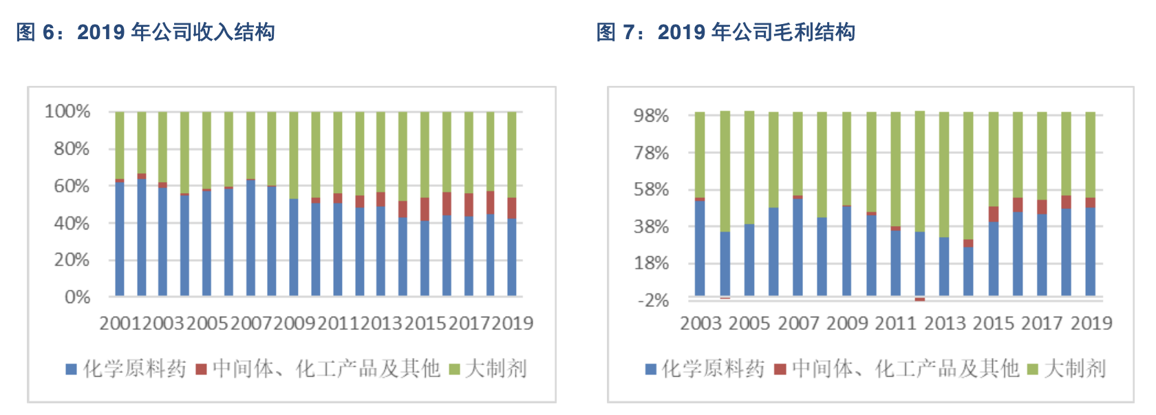 2001年公司业务结构以原料药为主,随着业务调整,公司逐步加大对于制剂业务投入,逐步形成制剂和原料药业务并重的格局(为发展大制剂战略,商业流通业务2015年被并入制剂业务)。2013年开始公司原料药毛利率提升显著,从2013年的16.76%提高至2019的34.70%,带动公司整体毛利率提升,原料药毛利占比也持续扩大,制剂业务如果剔除原本流通业务印象毛利也在持续增加。