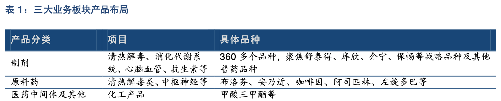 目前公司已经形成以制剂、原料药和医药中间体三大业务板块为核心的布局,制剂主要包括清热解毒、消化代谢、心脑血管、抗生素等领域,战略品种有舒泰得、库欣、介宁、保畅等;原料药主要包括清热解毒和中枢神经类,主要有布洛芬、安乃近、咖啡因、阿司匹林和左旋多巴等;医药中间体主要包括甲酸三甲酯等化工产品,除部分外售外,也主要为原料药和制剂的发展提供配套服务。