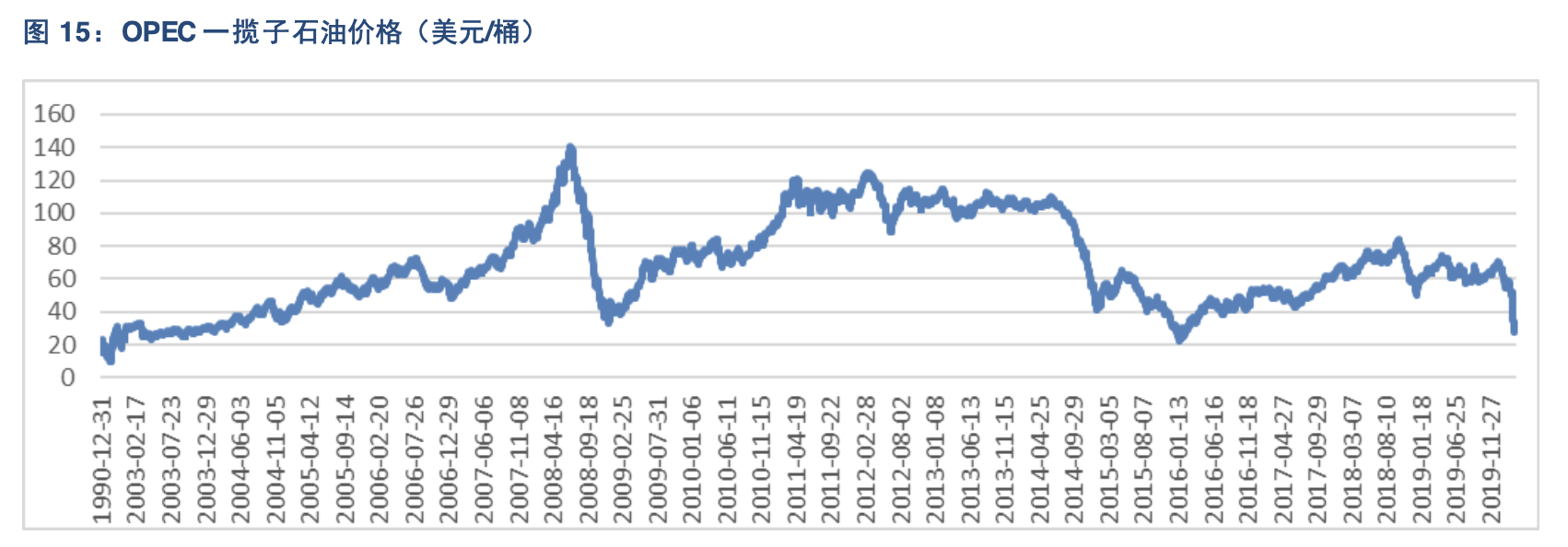 原油受海外产能增加影响价格近期大幅下跌。今年3月6日OPEC+会议未能就具体减产规模和配额达成一致协议,沙特抢先石油价格战,宣布增加产量并下调售价,原油期货价格一夜之间暴跌30%。根据OPEC一揽子石油价格显示,石油价格从2月底的59美元/桶降至近日的27.3美元一桶,降幅超过50%,预计将利好下游的化工产业链。