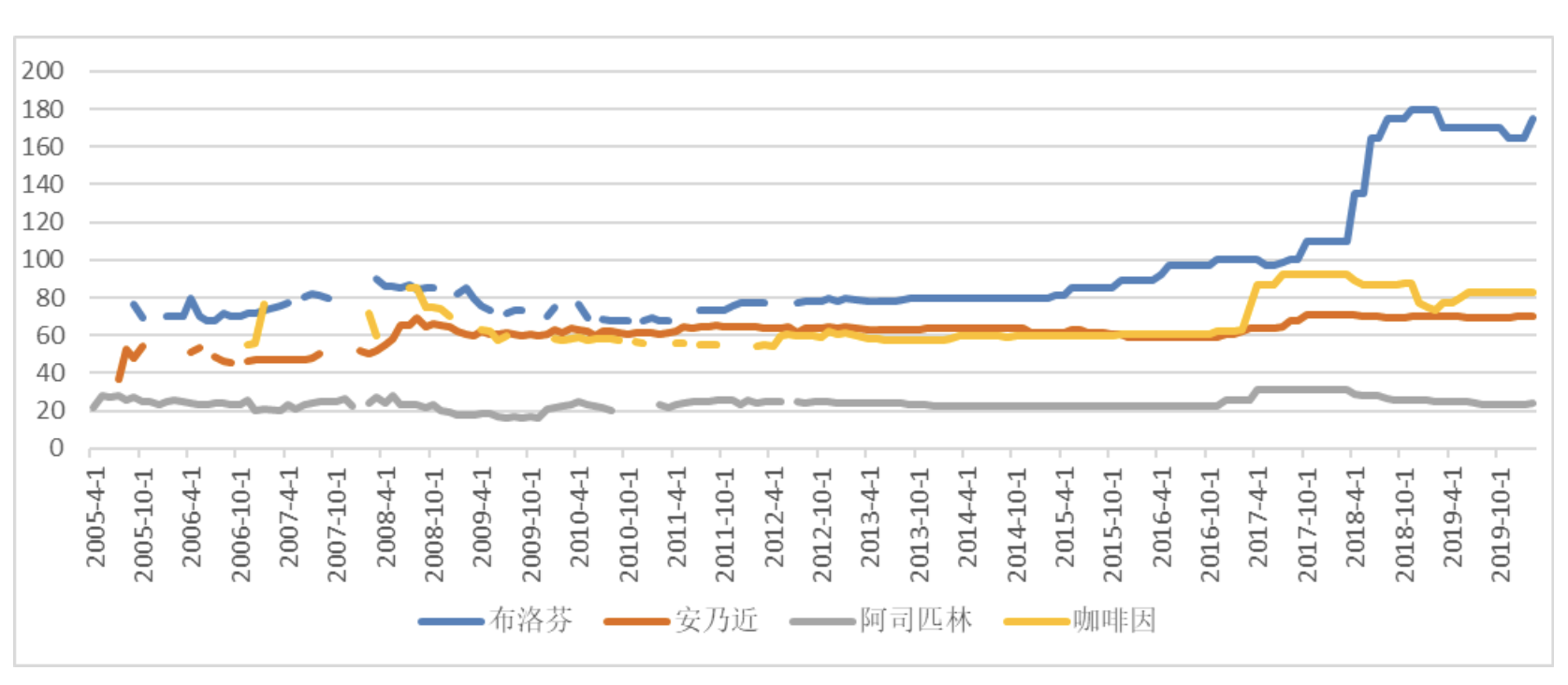解热镇痛类供应集中度高,公司议价能力强。就公司主要解热镇痛类品种布洛芬、安乃近和阿司匹林而言,排名前10位的企业出口金额合计占比分别为99.71%、94.67%和89%,尤其以排名前三的生产厂家为主,一般供应比例超过90%,市场集中度高,呈现明显的寡头竞争。