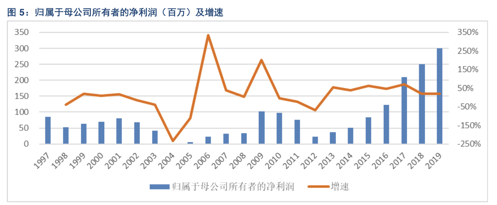 从2001年开始公司营业收入持续增长,增速基本维持在10-15%之间,与医药行业增速基本持平,2005-06年行业经历反商业贿赂整改,叠加国家2次降低药价,公司制剂收入增速出现阶段性低点而拖累公司整体业绩,2012年原料药国际市场需求低迷,竞争激烈而增速下滑,同时制剂业务也受到招标降价的影响,从而影响公司整体增速,2015年则是公司因为厂区搬迁改造收入增速有所下滑。2015年由于公司战略转变,发展得以提速,收入增速逐年增加,2019年公司收入56.07亿元,同比增长6.92%,收入增速略有下滑,主要是由于化工中间体因大环境原因有所下降及公司考虑长期发展对原料药订单周期的调节。