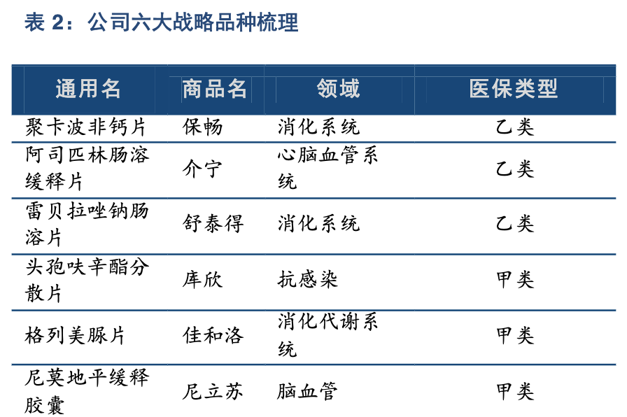 聚卡波非钙是公司2014年获批的3.1类新药,主要用于改善肠易激综合症(IBS)的便秘、腹泻、腹痛及腹胀等消化道症状;介宁主要应用于冠状动脉狭窄引起的心脑血管疾病,是公司基于自身研发基础并结合阿司匹林生化特性而首创的小剂量肠溶缓释剂型;舒泰得(雷贝拉唑钠肠溶片)属于三代质子泵抑制,2009年上市,属于国家医保乙类品种,临床上主要适用于消化系统溃疡及返流性食管炎等的治疗,与一代质子泵抑制剂相比,雷贝拉唑钠肠溶片具有独特优势,总体疗效要于奥美拉唑。尼立苏(尼莫地平缓释胶囊)缓释胶囊生物利用度高,主要用于缺血性脑血管病、偏头痛、轻度蛛网膜下腔出血所致脑血管痉挛、突发性耳聋及轻中度高血压,适用范围较广,性价比较高。此外还有头孢呋辛酯和格列美脲两个制剂,均已被纳入国家带量采购目录,公司未来有望凭借突出的成本优势低价扩展全国市场。