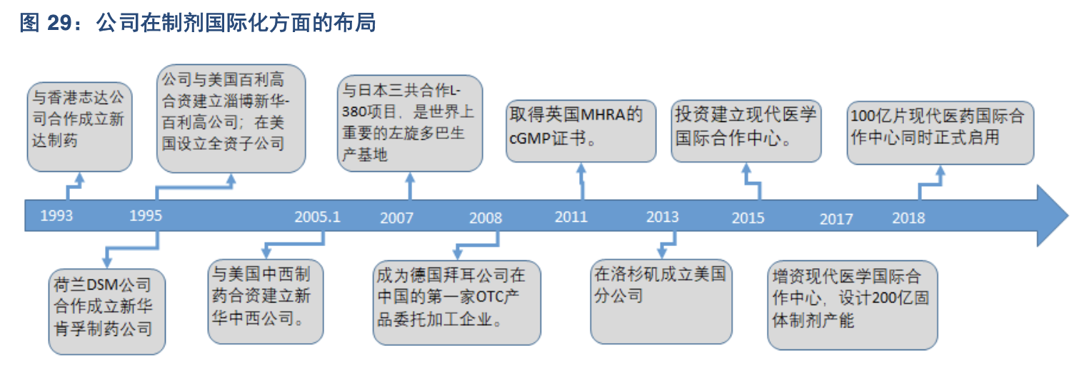 新华制药在20世纪90年代就开始国际化工作,在国际化前期,基于历史原因公司产品出口发展长期偏重于原料药板块,在原料药的国际注册方面投入了巨大精力,多个关键品种获得了美国、欧盟认证,奠定公司原料药良好的口碑,起到很好的辐射作用,近年来为进一步优化产业结构,公司适时推出了“制剂国际化战略”,实施产业链升级改造,如美国第新华公司合资成立新华-百利高公司,成为世界上最大的布洛芬生产企业;与美国中西公司合资成立了新华中西公司,先后与日本三共制药、德国拜耳公司进行合同加工生产,分别生产原料药新产品左旋多巴以及制剂委托加工。2015年3月底公司拟投资1.82亿元建设现代医药国际合作中心项目,包括固体制剂车间以及配套医药仓储物流中心,2017 年10 月对新华制药现代医药国际合作中心计划总投资8 亿多元,按国际先进GMP标准建设,年生产能力200亿片,该项目启用后,将大大推进新华制药新旧动能转换和产业升级步伐,成为新华制药发展的新起点。