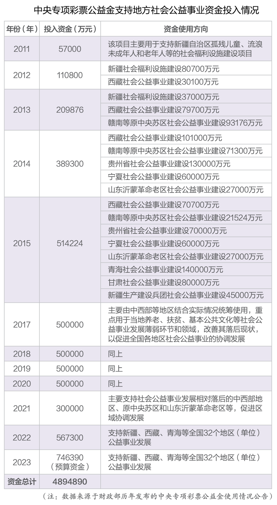 今年4月,财政部发布了《关于下达2023年中央专项彩票公益金支持地方社会公益事业发展资金预算的通知》(财综〔2023〕14号),其中提到,2023年,中央专项彩票公益金支持地方社会公益事业发展预算资金共计746390万元,将支持全国32个地区(单位)的社会公益事业发展。