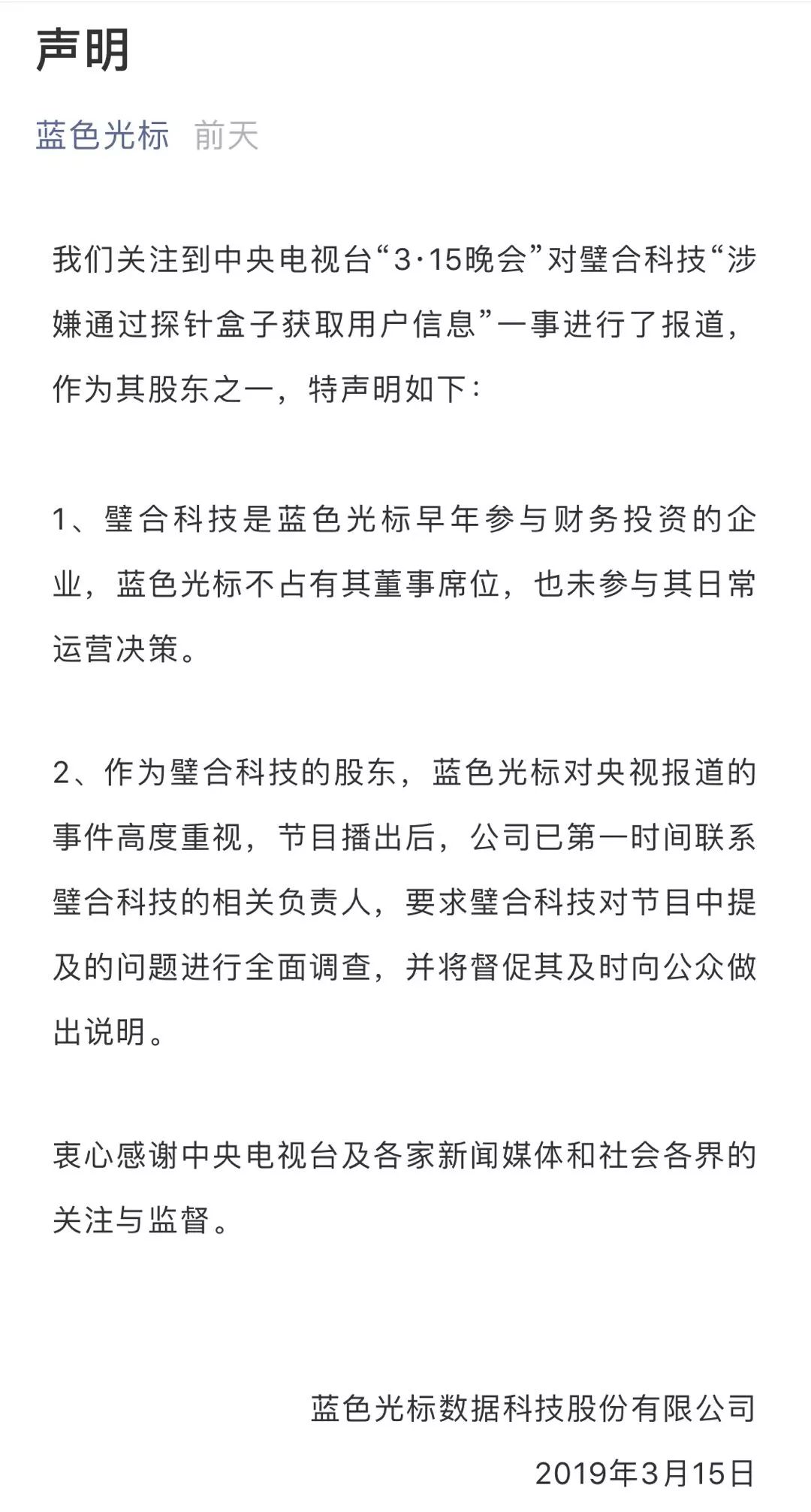 15日晚间,璧合科技股份有限公司背后的股东蓝色光标快速对此事回应,璧合科技是蓝色光标早年参与财务投资的企业,蓝色光标不占有其董事席位,也未参与其日常运营决策。作为璧合科技的股东,蓝色光标要求璧合科技对节目中提及的问题进行全面调查,并将督促其及时向公众做出说明。