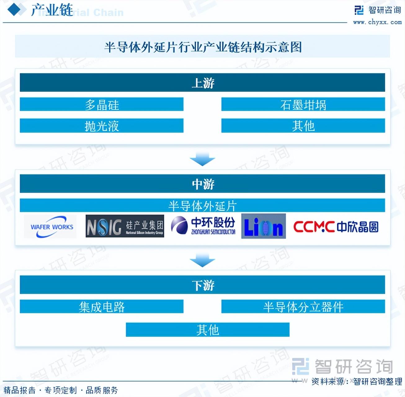 半导体外延片行业产业链结构较为清晰,上游为半导体外延片原材料,主要为多晶硅、石墨坩埚、抛光液等;产业链中游为半导体外延片生产商;产业链下游为集成电路、半导体分立器件等。