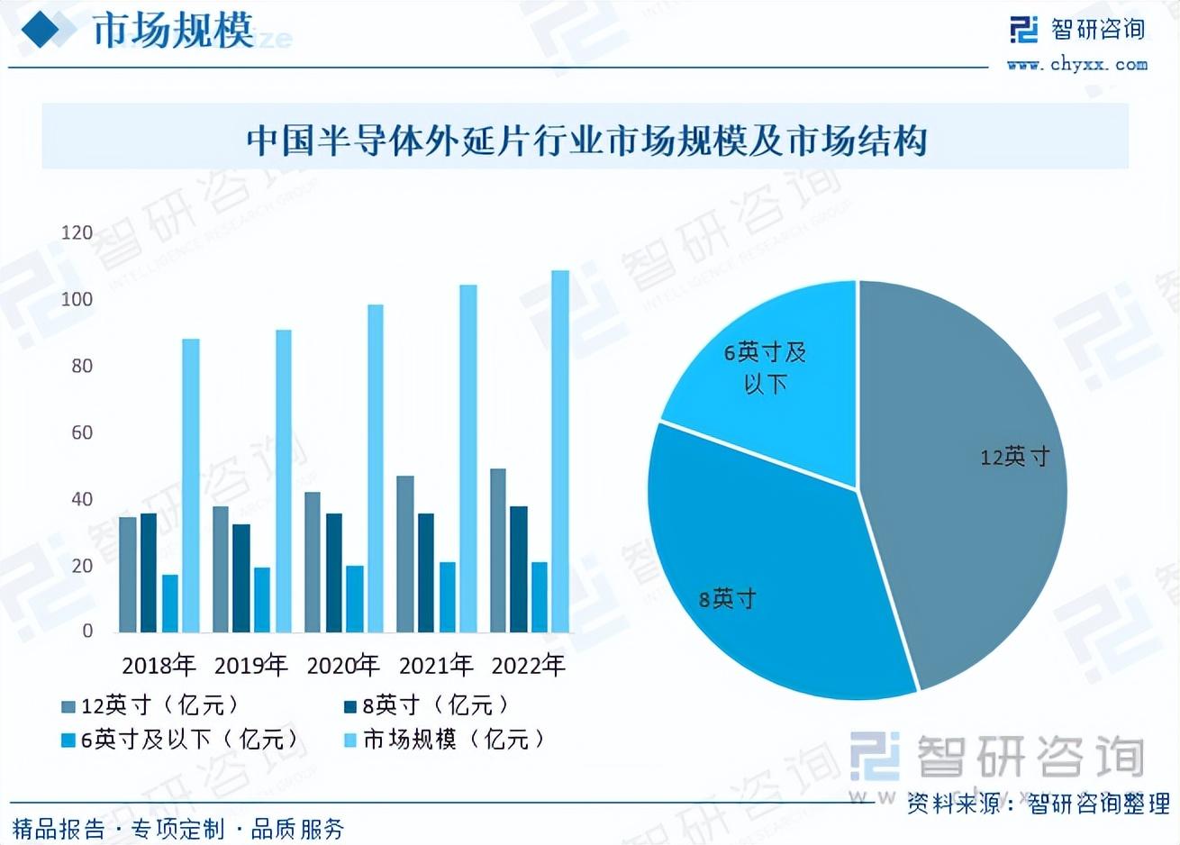 中国在半导体外延片领域的技术创新取得了一些重要成果。中国的企业和研究机构不断改进和优化制备工艺,提高外延片的质量和性能。一些关键技术和工艺达到了国际领先水平。中国在半导体外延片的国产化进展也值得关注。一些中国企业已经开始生产国产化的外延片产品,减少了对进口外延片的依赖,提高了国内半导体产业的自主性和竞争力。中国政府对半导体外延片领域给予了政策支持。政府出台了一系列政策,鼓励企业投资建设外延片生产线,提供财政和税收优惠政策,加强对外延片产业的扶持和引导。根据数据显示,中国半导体外延片行业市场规模呈现逐年上涨态势,2022年中国半导体外延片行业市场规模为108.9亿元,其中占比最重的为12英寸,占比45.27%。
