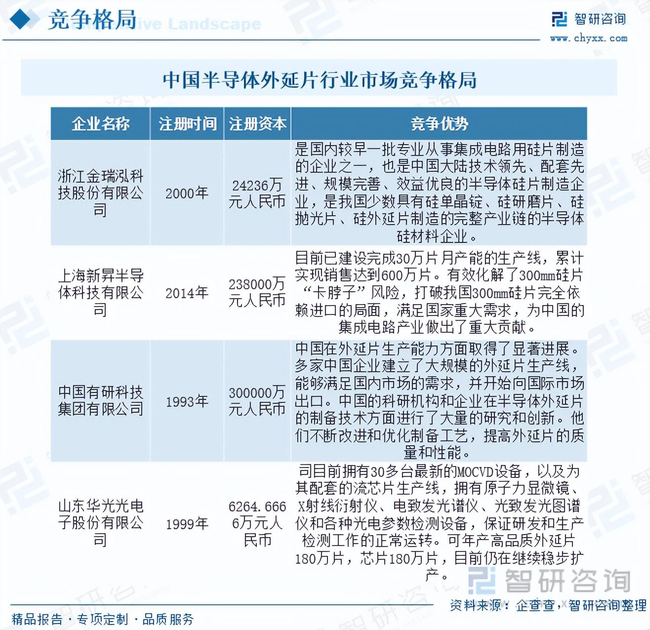 中国政府鼓励和支持半导体外延片产业的发展,尤其是国产化进程。中国半导体外延片市场的集中度相对较高,主要由少数大型企业主导。其中主要参与者为金瑞泓、上海新昇、中国有研、华光光电等。主导企业在半导体外延片产能方面具备一定的优势,这使得市场的产能相对较为集中。少数大型企业拥有大规模的外延片生产线,能够满足较大部分的市场需求。在技术方面,主导企业具备较强的研发和创新能力,拥有先进的制备工艺和产品质量控制能力。他们在技术创新和工艺改进方面具有一定的竞争优势。