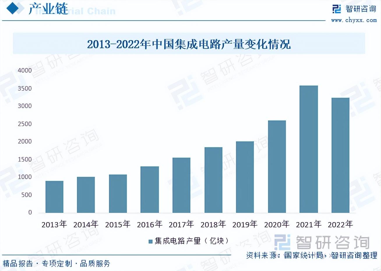 半导体外延片产业链下游主要为集成电路,根据数据显示,中国集成电路产量在2022年略有下降,2022年全球芯片供应链紧张,包括原材料、设备和制造能力等方面的瓶颈。这可能导致中国集成电路产业面临原材料供应不足、设备短缺和生产能力受限等问题,从而影响产量。2022年中国集成电路产量为3241.9亿块。