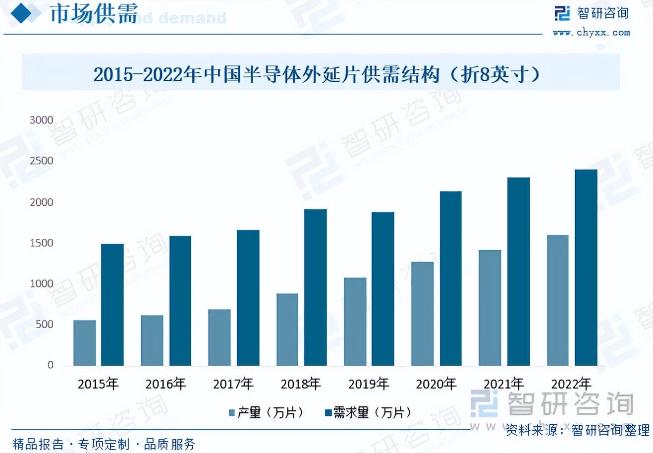 中国半导体外延片产量及需求量呈现逐年上涨态势,产量从2015年的566.4万片上涨至2022年的1601.5万片,其需求量大于产量,根据数据显示,中国半导体外延片需求量从2015年的1494万片上涨至2406.2万片。中国半导体外延片的供需结构呈现供给能力不断提升、技术创新推动供给种类增加和国产化进展等特点。需求端则主要受市场需求增长、应用领域扩展和技术需求升级等因素的影响。供给和需求的相互作用将影响中国半导体外延片市场的发展和供需平衡。