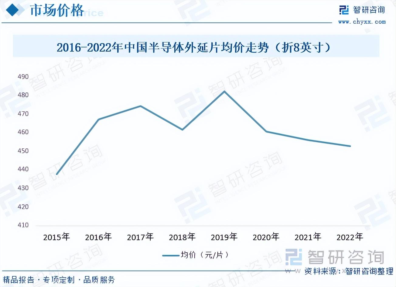 根据数据显示,中国半导体外延片价格从2015年至2017年呈现上涨态势,2017年至2020年呈现涨跌的震荡态势,2020年至2022年呈现缓慢下降态势,2022年中国半导体外延片均价为452.6元/片。