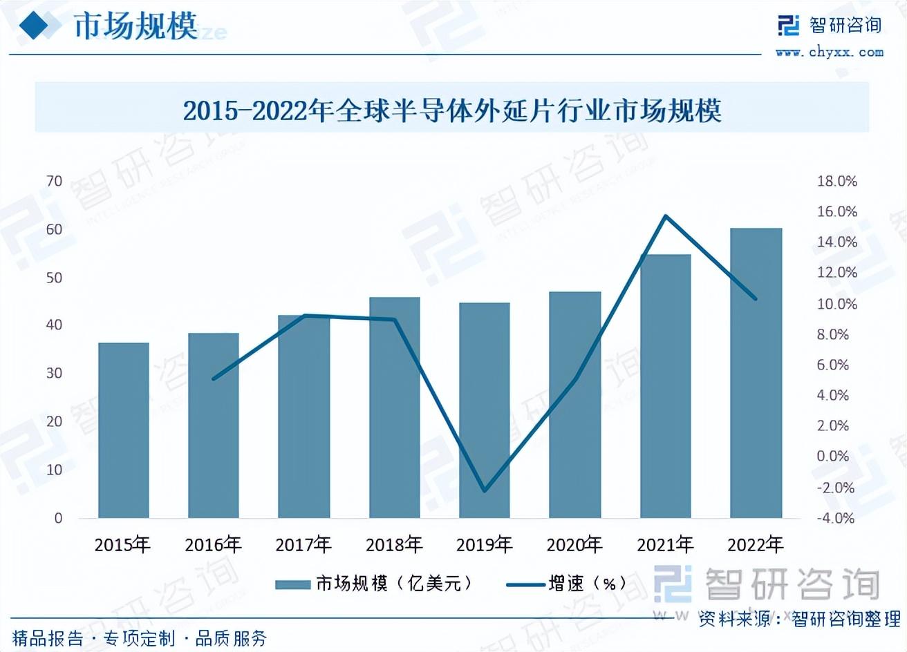 根据数据显示,全球半导体外延片市场规模呈现逐年上涨态势,从2015年的36.8亿美元上涨至2022年的60.6亿美元,年复合增长率为7.39%。全球半导体外延片市场竞争激烈,主要由一些大型跨国公司和地区性企业主导。这些企业在技术实力、生产能力、产品质量和客户服务等方面具有竞争优势;技术进步和创新、智能手机和消费电子产品的需求增长、物联网和人工智能等新兴应用的推动、电动汽车和可再生能源等领域的发展。预计未来全球半导体外延片市场规模将继续呈现上涨态势。