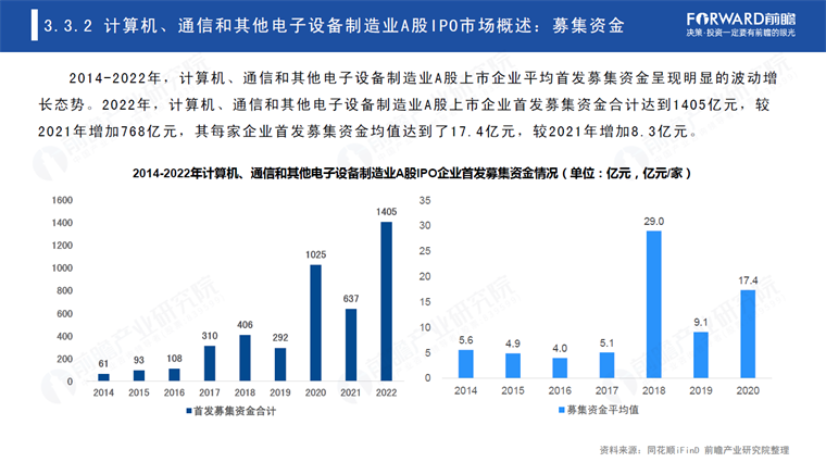 众所周知,这类产业属于高新技术,我国在部分领域还处于被“卡脖子”状态,通过证券市场支持可以为这类产业提供充足的资金需求。据前瞻产业研究院统计,2022年,计算机、通信和其他电子设备制造业A股上市企业首发募集资金合计达到1405亿元。